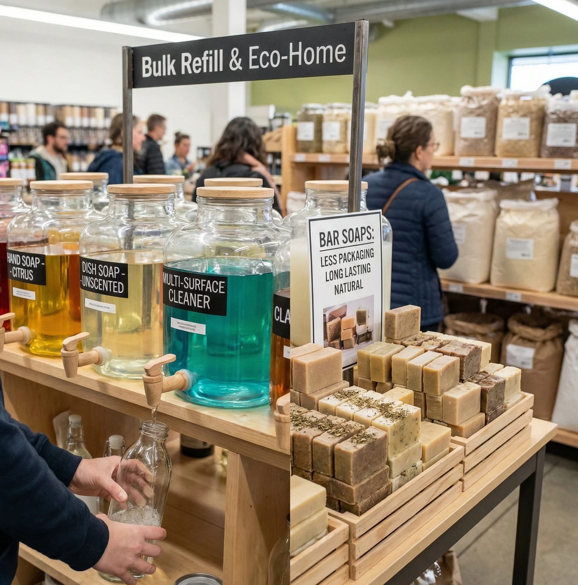 Many stores now offer refill stations for hand soap, dish soap, and other cleaners. Refilling from bulk skips loads of packaging over time. Bar soaps are another way to skip waste for hand and body washing. Bars come with less packaging, last a long time, and often feature all-natural ingredients.