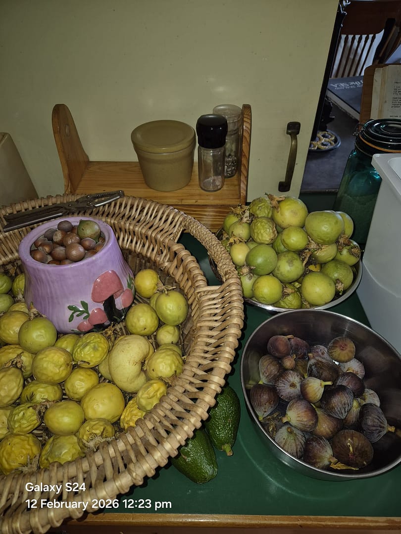 The kitchen bench tells the story better than I can. Pears piled into a white tray, still wearing a few leaves like they refused to clock off. Mixed in with them are bright yellow lemonade fruit, glowing softly and pretending they’re just lemons with better personalities. Figs gathered into a metal bowl, purple and plump. Passionfruit clustered in baskets. Avocados quietly waiting their turn. Even a few Macadamias needing to be shelled.